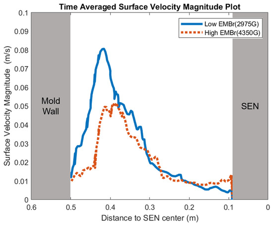 Figure 7 shows the flow formation of Case 1 and Case 2. Here, the impact of EMBr on the surface wave was very evident. Case 1 utilized a stronger EMBr strength of 4350 G, while Case 2 utilized a lower EMBr of 2975 G. The height was kept constant at 0.95 m, the width was kept constant at 1.067 m, and the SEN depth was kept constant at 110 mm. In Case 1, because of the larger magnitude of the EMBr strength, the flow was recirculating around a larger magnetic field. Based on the figures, the impact of EMBr was clearly visible on the flow formation. In the mentioned plot, the horizontal distance measured started at the SEN center at x = 0 m to the mold wall in the left direction at x = 0.534 m. The recirculation zone of the molten steel was around the applied magnetic field. A larger EMBr resulted in the flow being directed more downwards and there was less impact on the surface wave.
