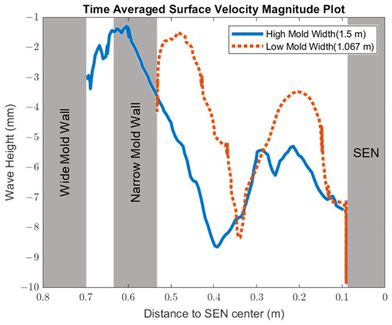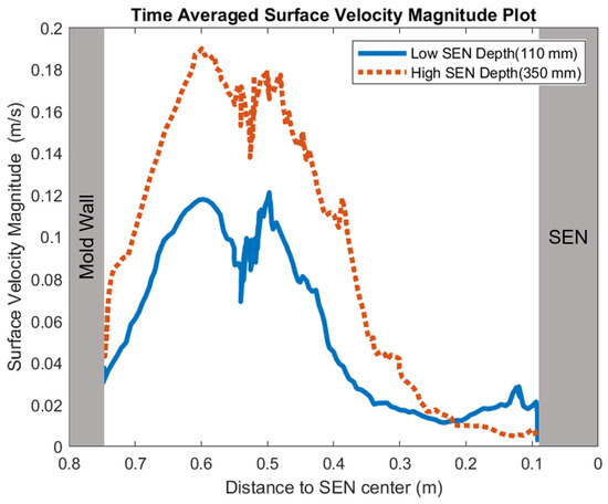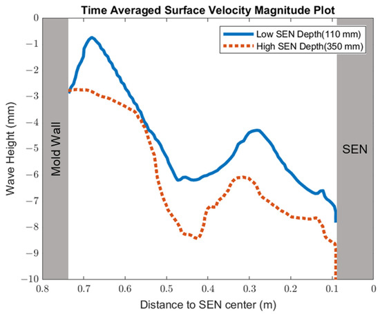 Figure 14 shows the surface standing wave height comparison. A higher SEN depth increased the height of the recirculation zone, which was more cluttered with more molten steel. This resulted in a larger amplitude for the surface standing wave. With a lower SEN depth, the flow was directly impacted by the Lorentz force dampening it. As shown in Figure 15, as the flow recirculated, the surface velocity was larger for the high SEN depth relative to the low SEN depth. With the average velocity magnitude at the surface increasing by 30% with the increase in SEN depth, as mentioned, at a lower SEN, the EMBr was applied directly next to the injection port of the SEN. The peak surface standing wave for a low SEN depth was 7.04 mm, with an average height of 4.29 mm. While for a high surface standing wave the peak was 8.55 mm, and the average surface standing wave height was 5.12 mm. When the SEN depth was increased from 110 mm to 350 mm, the average height increased by 19%. Figure 16 shows the total flux volume in the mold comparison between a low and high SEN depth. At 110 mm, the flux volume decreased by 6 × 10−7 m3 per second while at 350 mm, the flux volume decreased by 8 × 10−7 m3 per second. Increasing the SEN depth increased the flux entrainment by 2.6% (Table 4).