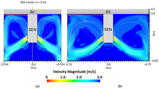 (a) Low mold width 1.067 m (Case 5) vs. (b) high mold width 1.50 m (Case 7) flow streamline.