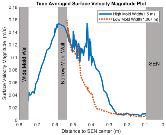 Low mold width (Case 5) vs. high mold width (Case 7) surface velocity comparison.