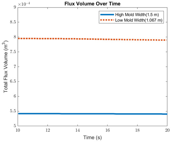 Low mold width (Case 5) vs. high mold width (Case 7) flux volume comparison.