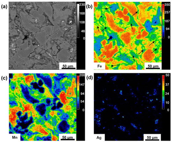 The microstructure of the consolidated sample (a) backscattered electron microscopy (BSE) and microprobe analysis (EPMA); (b) Fe (arrows represent the γ-FeMn phase); (c) Mn; and (d) Ag.