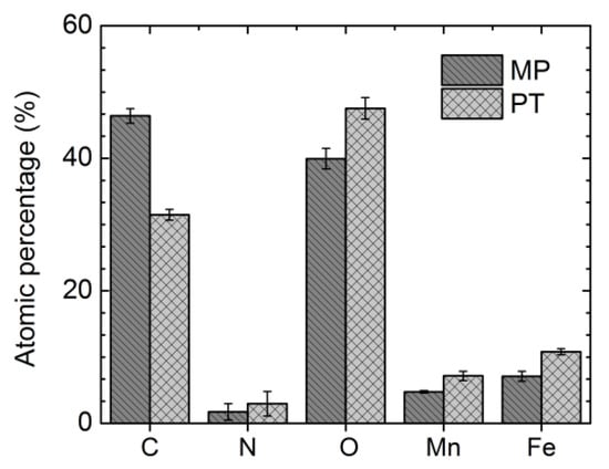Table 3 presents the binding energy values, full width at half maximum (FWHM), the area and fitting parameters of the peaks (percentage of the Gaussian contribution, and chi-square (χ2)) for C1s, O1s, N1s, Fe2p3 and Mn2p3 spectra of the samples. The C1s spectra (Figure 3a,b) showed three peaks at 284.8 ± 0.1 eV, 286.3 ± 0.1 eV and 288.4 ± 0.1 eV for both investigated conditions. The peak related to the hydrocarbon compounds is a well-known reference peak for C1s at 284.7 eV []; its surface area was 69.9 and 85.7% for the MP and PT samples, respectively. It has been observed that even under a vacuum condition, the carbon contamination, due to the presence of CO, CO2 and CHO groups, takes place [], and in the present case, the carbon reaction with the surface was increased after the PIII treatment. One possible mechanism could be the interaction of CO and CO2 with the surface metallic oxide, e.g., iron oxide, and consequently the oxy-hydrocarbons formed on the surface []. The peak at 286.3 ± 0.1 eV could be associated with the presence of C–OH, C–O–C, C–O and C–N [,]; the area attributed to this energy band decreased from 12.3 to 4.8% after plasma treatment. The C1s contribution at 286.3 eV [] could be attributed to the ethoxy species, such as ethanol; for the polishing of the samples was carried out in ethanol, the decrease of the C1s peak area at 286.3 ± 0.1 eV could be the result of the ethoxy species removal after the PIII treatment. Similarly, the peak area of C1s at 288.4 ± 0.1 eV, attributed to the carbonate species [,], decreased from 17.8 (MP condition) to 9.5 at.% (PT condition).