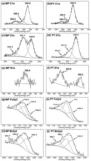 XPS high resolution deconvolutions for MP (a) C1s, (c) O1s, (e) N1s, (g) Fe2p3, (i) Mn2p3; and for PT (b) C1s, (d) O1s, (f) N1s, (h) Fe2p3 and (j) Mn2p3.