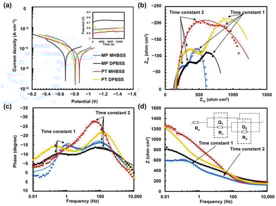 Electrochemical test results of the investigated conditions in MHBSS and DPBSS: (a) potentiodynamic polarization tests (inset shows the open circuit potential evaluation); (b) Nyquist diagram and the fitted model (lines); (c,d) Bode diagram of the samples with the fitted model (lines) (inset in (d) shows the equivalent circuit for the studied conditions). Time constants 1 and 2 are indicted by the arrows in low (1 Hz) and middle (100 Hz) frequencies.