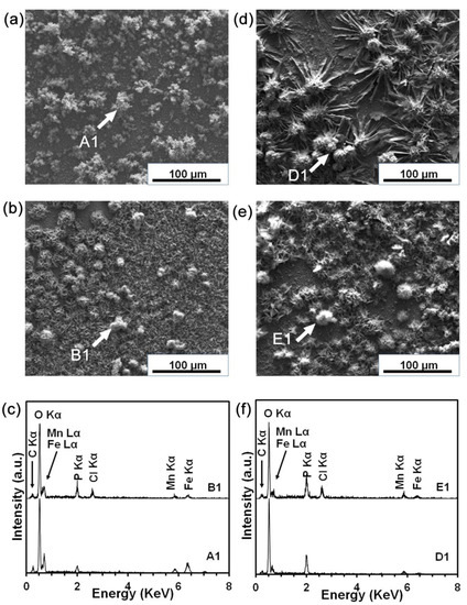 The surface morphology after the potentiodynamic test in DPBSS and MHBSS showed significant differences (Figure 5a,b,d,e). The EDS analysis evidenced the presence of O and P on the surface of all of the studied conditions. This could be associated to the formation of passive layers. As evident from all of the reported spectra (Figure 5c,f), P and O could be associated with the formation of phosphate passive films on the surface. These precipitates could hinder the ionic exchange and consequently block further material dissolution []. As DPBSS contains more P than MHBSS, flower-shaped phosphate precipitations were formed on the surfaces immersed in DPBSS (Figure 5d,e).
