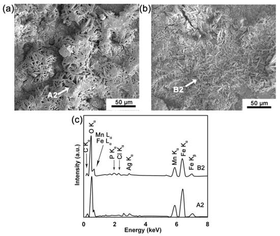 The surface morphology and chemical composition of the MP and PT conditions after 14-day SDITs in MHBSS are presented in Figure 6. The surfaces of both conditions, after the test, were covered by a layer of degradation products, containing Fe, Mn, O, Cl, P and C. The chemical compositions were compatible with that from a layer containing phosphates and carbonates of Fe and Mn, as already found [,]. This implies the formation of a degradation product layer on the PT condition, corresponding to the fine precipitations in Figure 5b, that were not removed with the cleaning. A punctual EDS analysis of the surfaces in Figure 6a,b (points A2 and B2, respectively) were compared in Figure 6c; they showed similar composition profiles, but the different thickness and morphology of the precipitate layers for the two conditions could be the main reason of the different corrosion behavior of the samples. Following the O and N implantation, the formation of new phases, in the form of nanocrystalline oxides and nitrides [,], took place. The fine-structure and uniform thickness surface layer played a role in the nucleation and growth of a thinner and homogeneous degradation product film, compared to the coarser one obtained for the MP condition.