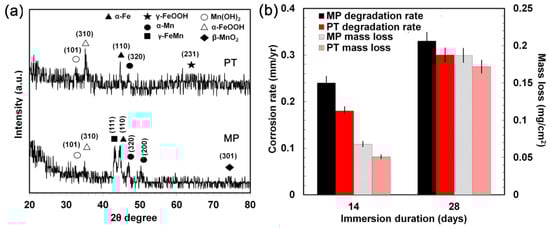 (a) Phase attribution for the MP and PT condition surfaces after the 14 day SDITs (GIXRD patterns); (b) static degradation rate and mass loss for the MP and PT conditions after 14 and 28 days of immersion.
