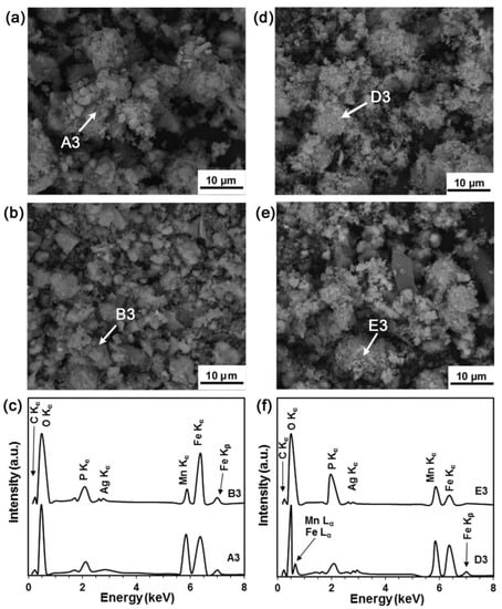 Degradation products after 14 days of immersion in MHBSS from (a) the MP and (b) PT conditions; (c) EDS for points A3 in (a) and B3 in (b). Analysis of the powders collected from the bottom of the solution, for (d) the MP and (e) PT conditions; (f) EDS for points D3 in (d) and E3 in (e).