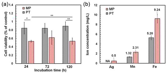 Figure 9a shows the cell viability of the samples through an indirect MTT assay. The metabolic activity of the cells improved to 84% for the PT sample from 53% for the MP sample after 24 h of incubation. These values were similar for 72 and 120 h of incubation, this outcome showed an acceptable cytocompatibility (more than 75% of the control []) for the PT condition.