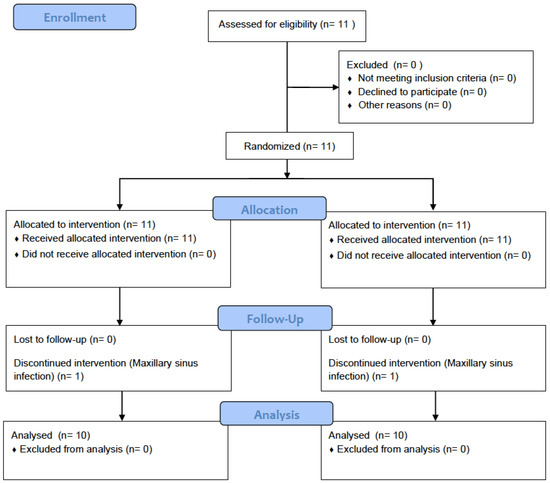 The number of subjects studied was determined by a power test performed (http://calculoamostral.bauru.usp.br/, accessed on 10 September 2019) applied with a beta of 20% and an alpha of 5%. The standard deviation used was 9.9 and the mean difference of 14.8 according to previous research conducted in a one-tail test [22]. The results showed a minimum of nine subjects with bilateral maxillary sinuses requiring to be grafted for the present research.