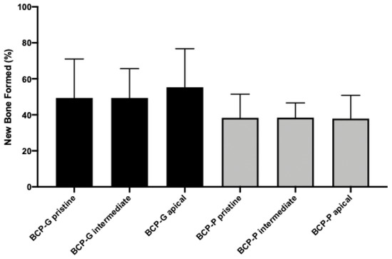 The group BCP-G presented with a new lamellar bone formation and osteoblasts on the periphery and the areas of woven bone. The connective tissue presents as well cellularized, and few particles of the biomaterial could be observed (Figure 2A). The mean of new bone formed in the pristine bone area was 49.4 ± 21.6%. The intermediate and apical regions were 49.4 ± 16.2% and 55,3 ± 21.4%, respectively. The connective tissue presented with a mean of 37.1 ± 24.5%, 41.4 ± 17.3%, and 37.6 ± 17.7% in the pristine bone, intermediate, and apical regions, respectively. The median of biomaterial remaining was 3.5, 3.5, and 0 for pristine bone, intermediate, and apical regions, respectively (Table 1, Figure 3 and Figure 4). The BCP-P group presented similar histological findings as the BCP-G group with more areas of woven bone (Figure 2B). The mean of new bone formed was 41.9 ± 17.3% for the pristine bone region. The mean was 37.5 ± 7.8% for intermediate and 39.0 ± 13.5% for apical. The connective tissue mean was 51.0 ± 14.2%, 57.0 ± 8.7%, and 49.8 ± 7.3% for the pristine bone, intermediate, and apical regions, respectively. The median of biomaterial remaining for the present group was 2.5% in the pristine bone. The median was 0 and 1.5 for intermediate and apical, respectively (Table 2, Figure 3 and Figure 4). There is no statistical significance for the new bone formed (p = 0.07) and biomaterial remaining (p = 0.45). For the connective tissue formed, the ANOVA test showed statistical significance (p = 0.02). However, Tukey’s multiple comparison test could not find where the statistical significance occurred though.