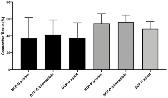 Graph showing the histomorphometric results of connective tissue in each region evaluated for BCP-G and BCP-P after six months of bone repair in human maxillary sinus augmentation.