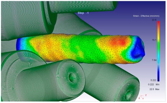30]; the rotation speed of the rolls was equal to 100 rpm. The friction coefficient at the contact of the billet and rolls was assumed to be 0.7, as the recommended value for hot rolling in deform. When rolling, the rolls were taken by rigid bodies, and the material of the billet was elastic-plastic.