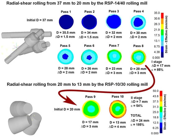 Based on the FEM simulation, graphs of the total strain by the passes were built, including eight passes on one rolling mill and two passes on the other rolling mill. After the rolling processing from 37 mm to 13 mm (ε = 185%), the total strain distribution for all cases has a gradient character with a final maximum (46 mm/mm) in the peripheral zone and a minimum (25 mm/mm) in the axial zone. This strain level is associated with the predominance of shear deformations due to the vortex flow of the metal, which is clearly seen in the simulation. The use of the second rolling mill makes it possible to significantly increase the total strain level and probable structure processing.