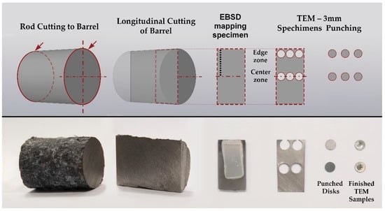 Sample cutting for all types of subsequent sample preparation was performed on a precision cutting machine Brilliant−220 (QATM) with intensive water cooling and a cutting speed of 5 μm/s to minimize deformation-temperature damage to the structure. Coarse-grained cut-off wheels were used at 700RPM. For electrolytic polishing of TEM samples, longitudinal plates 0.3 mm thick were cut from the central part of the rod, and 3 mm disks were punched out of them with the Disc Punch tool by Gatan. For SEM/EBSD, thicker plates 2 mm thick were also cut from there. The cutting scheme is shown in detail in the experimental part.