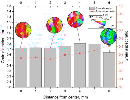 Figure 10. A typical view of the structures in the respective zones is shown in thumbnails above the graph. A certain gradient of elongation of the grains towards the center of the bar is clearly visible (decrease in the value of the aspect ratio). In this case, the average size remains approximately the same throughout the entire section with a sharp dip in the most extreme value. Additionally, there is a noticeable gradient in orientations with a clear increase in the predominance of orientations to the axis of the bar coaxially with the direction of rolling. In this case, the shape of the grains differs significantly from those described earlier in the axial zone after such a process [