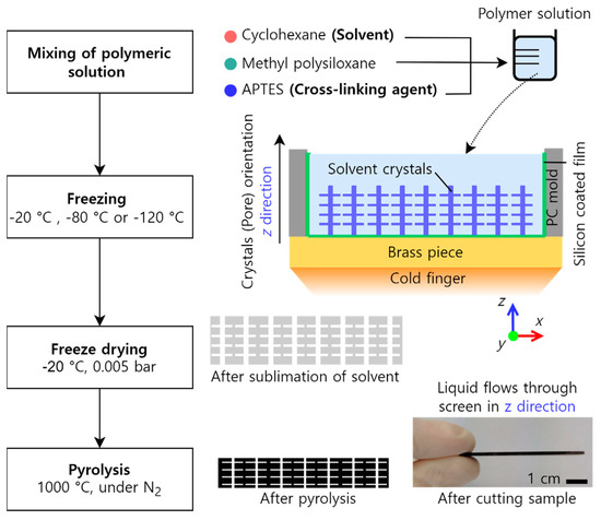 The complete manufacturing route of the screens via the freeze-casting process is shown in Figure 1. The preparation of the polymer solution started with dissolving the preceramic polymer MK in the solvent CH under vigorous stirring at room temperature. Subsequently, the cross-linking agent APTES was added to the mixture forming the polymeric solution. The solution was then poured into the sampling mold and degassed at 0.3 bar for 15 s to remove any gas bubbles created during the stirring or casting procedure. The freezing of the solution started in the sampling mold after the mold with the cast solution was exchanged for a control mold, which was used on the cold finger to set the temperature. In this way, ice formation on the surface of the brass piece was avoided during the stabilization of the freezing temperature. The molds consisted of an upper part made of polycarbonate (height of 20 mm) and a lower part made of solid brass, which was in contact with the top of the cold finger of copper (Figure 1). A silicone-coated polyester film with a thickness of 30 µm (Hostaphan RN 302SLK, Mitsubishi Polyester Film GmbH, Wiesbaden, Germany) was used on the bottom of the mold to facilitate the demolding of the frozen sample. At the top of the cold finger and near the brass piece, a resistance heater was installed while the other side of the cold finger was immersed in liquid nitrogen. A thermocouple was positioned in the brass piece to control and indicate the interface temperature between the solution and the brass piece. The solutions were frozen when the temperature indicated by the thermocouple was at −20 °C, −80 °C, and −120 °C. After complete freezing, the samples were placed inside a freezer at the lowest temperature at −20 °C for 72 h for sufficient and faster cross-linking while maintaining the samples frozen. Subsequently, the samples were freeze-dried at −20 °C and 5000 µbar. After freeze-drying, the samples were removed from the freeze-dryer and stored at room temperature. Finally, the samples were pyrolyzed under a flow of high-purity nitrogen (99.999%). The heating rate up to 900 °C was 120 K/h and up to 1000 °C was 30 K/h. The samples dwelled at the maximum temperature for 4 h and were subsequently cooled down to room temperature at a cooling rate of 120 K/min.