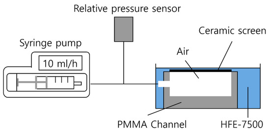 In the setup for the bubble point tests, the SC-LAD was placed horizontally in an HFE-7500 liquid bath (Figure 2). The external liquid level was adjusted such that only a thin liquid layer covered the ceramic screen and no test liquid entered the PMMA channel. The outlet of the SC-LAD was connected to a syringe pump which was used to pressurize the channel from the inside with a controlled volumetric flow rate (10 mL h−1).