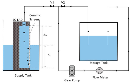 The phase-separation experiment setup depicted in Figure 3 consisted of the supply tank (containing the SC-LAD, homemade at ZARM institute)), storage tank, gear pump, flow meter, connecting pipes, and operating valves V1 and V2. The gear pump used in the experiment had a gear head (GA-V21, Micropump, Vancouver, DC, USA) along with a variable speed drive (Reglo-Z, ISMATEC-Micropump, Vancouver, DC, USA) to pump the liquid in a loop. The flow meter used for volumetric flow rate measurement was from Kobold LFM. The measuring range of the sensor is 0.08 mL s−1 to 4.17 mL s−1. The accuracy of the sensor is ±2.5% of the measured value. At the beginning of the experiment, the supply tank was filled with the test liquid, and the SC-LAD was immersed inside the supply tank. With the aid of the gear pump, the SC-LAD was saturated with the liquid, and the gas from all the pipelines was replaced with the liquid. The flow rate of the pump was set to a fixed value and the liquid flow was established in the closed inner loop in which the liquid flowed out of the storage tank and back to the storage tank via the opened valve V2, the gear pump, and the flow meter. When the flow rate became stable, valve V2 was closed and valve V1 was opened simultaneously to start the liquid removal from the supply tank through the SC-LAD. Thus, the liquid flowed from the supply tank to the storage tank via valve V1, the gear pump, and the flow meter.