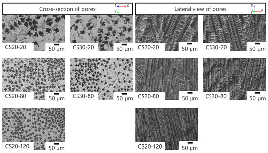 The SEM images show the formation of a dendritic pore morphology which typically occurs when cyclohexane is used as a solvent during freeze-casting [33,37]. The lateral view of the pores shows an aligned pore structure with primary dendritic arms (bigger pore size) and secondary dendritic arms (smaller pore size) parallel and perpendicular to the mass transport direction, respectively. The SEM images from the cross-section show the exclusive formation of primary dendritic pore windows and the absence of macro defects such as cracks or abnormally large pores. Furthermore, Figure 5 shows that the size of the frozen solvent crystals, and thus the pore size, decreases as the freezing temperature decreases (i.e., the degree of supercooling increases) [15]. Higher-magnification images of SEM are placed in the supplementary data, in Figure S4.