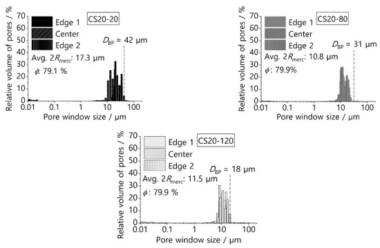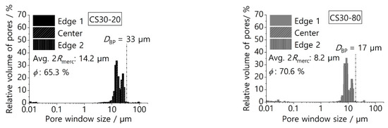 Overall, the average pore window size varies between 8.2 µm and 17.3 µm depending on the freezing temperature and solid loading, and the pore sizes can be found in the range between 6 µm and 43 µm. Within the same sample, an extensive overlap of pore size distribution from the edges and the center of the screen can be seen, which confirms (quantitatively) the homogeneity of the screens. The quantitative results shown in Figure 6 and Figure 7 confirm the qualitative observations in Figure 5 regarding the decrease in pore window size with the decrease in freezing temperature. The average open porosity varies between 65.3% and 79% and is mainly influenced by the solid loading. This correlation is documented in the literature and applies to samples produced by freeze-casting of either oxidic ceramic particles or preceramic polymers [38]. Figure 6 shows that screens with a solid loading of 20 wt% have a wider and more homogenous pore size distribution. Thus, a clear distinction between primary and secondary dendritic arms is not viable for screens with 20 wt%. In contrast, the screens with 30 wt% show a bimodal pore window size distribution, and a distinction between the secondary and primary dendritic arms is possible here (Figure 7). The ratio between the pore window size of primary and secondary dendritic arms are 1.68 and 1.75 for screens frozen at −20 °C and −80 °C, respectively. These values are close to the ratio of 2 already reported in the literature for aligned dendritic pore structures created from freeze-casting of preceramic polymers [39,40]. For samples with a higher solid loading, although the primary dendritic arms still have a greater influence on mass transfer within the pore structure due to their orientation in the direction of flow, the numerous secondary dendritic arms that grow from a primary dendrite often have a much larger pore volume [39]. These secondary pores are often not interconnected [41] and are perpendicular to the mass flow, thus representing an additional path for liquid flow and slowing it down during the phase separation. Moreover, the values of the bubble point diameter were calculated using Equation (1) and the measured bubble point pressure. These values are shown in Figure 6 and Figure 7 for comparison and for each screen, the value of falls close to the biggest pore window sizes measured with Hg intrusion. This cross-check of the biggest pore diameter was important for the LAD development, as it showed that there were no major defects or leaking joints (e.g., cracks or pores bigger than 50 µm). In addition, the screens were tested in three-point bending tests, as space applications generally require good mechanical stabilities and thus corresponding long-term stability of the materials. Figure S2 shows flexural strength values from 12.41 MPa to 16.76 MPa with the open porosity having the greatest influence on the mechanical strength. Due to these good mechanical stabilities, the screens broke neither during the assembly of the SC-LADs nor during the gas-liquid phase separation. To confirm the mechanical stability of the screens during phase separation and that the liquid removed through the SC-LAD was particle-free, 10 mL of the extracted liquid was collected after testing every applied removal volumetric flow rate. This procedure was performed on sample CS20-20, as this screen showed the biggest pore window sizes and higher open porosity, and therefore, should possess the lowest mechanical stability. The collected liquid was filtered using a paper filter and Figure S3 shows SEM images of filter paper before filtering the liquid and after gas–liquid phase separation. Results from the pore structure characterization, sample dimensions, and permeability values are summarized in Table 3 below. Permeability values are discussed in the next section.