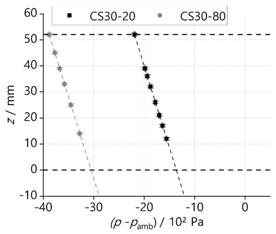 Experimental data (symbols) and calculated hydrostatic head (dotted lines, Equation (14)) from phase−separation experiment at different flow rates for samples with 30 wt% of solid loading. Details corresponding to each data point are given in Table 7 and Table 8. The vertical error bar for height measurement z is ±0.5 mm and the horizontal error bar for pressure difference () is ±0.1 hPa.