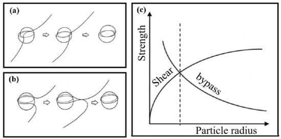The strengthening effect of the second phase is derived from the ability of the second phase to hinder the motion of dislocations. The strength is determined by the size and distribution of the precipitates and the coherence of the precipitates with the matrix [16]. The interaction between dislocations and the second phase can be described by shear and bypass mechanisms. Figure 1 is the relationship between dislocations and precipitated phases [17,18,19]. The small and not too hard precipitated phases are sheared when they encounter dislocation movement (the shear mechanism is also called the Friedel mechanism), as shown in Figure 1a. When the size of the precipitate is larger and harder, the dislocation bypasses the precipitate by bending (bypasses mechanism), as shown in Figure 1b. As long as the precipitates are sheared by dislocations, the strength of the alloy will increase. With the further growth of the precipitated phase, the shearing process becomes quite difficult. Dislocations are more conducive to bypassing the precipitates, resulting in the reduction of alloy strength. As shown in Figure 1c, the highest strength is obtained when the dislocations pass through the precipitate with shear and bypassing with equal probability. Generally, the bypass mechanism includes two mechanisms, one is Orowan shear loops, and the other is Hirsch prismatic loops [20]. Dislocation with any character angle will form dislocation shear loops around the precipitate after bypassing the precipitate, resulting in Orowan strain hardening. If all dislocations are edge-oriented, when bypassing the precipitate, a prismatic loop will form on either side of the precipitate when bypassed, which is called Hirsch looping. In addition, it has been shown that two dislocations can form a dislocation dipole, which plays an important role in the plastic deformation of materials, especially fatigue and creep [21].