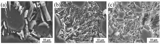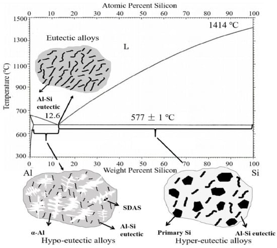 The solid solubility of Si in aluminum is 1.65 wt.% (577 °C), but decreased to 0.05 wt.% at room temperature [23]. The addition of Si to aluminum alloy can reduce the volume shrinkage and improve the fluidity, thus improving the casting performance of aluminum alloy [24]. For Al–Si cast aluminum alloy, the Si content is usually selected between 5% and 23%, and the Al–Si eutectic reaction occurs at 12.6 wt.% Si [25]. As shown in Figure 2, different Si contents lead to different microstructure of Al-Si alloys. The influence of Si elements on the mechanical properties of the alloy is related to the Si content and the morphology of eutectic silicon particles: when the Si content is between 4 and 20%, the yield strength first increases and then decreases with the increase of Si content [26]. In addition, the addition of Si to the alloy often results in the formation of large plate-strip eutectic structure, and the morphology of eutectic Si is usually changed from large plate-strip to small fibrous morphology through modification to improve the toughness of the alloy [27].