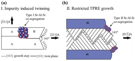 Many assumptions about the research on the modification mechanism of eutectic Si are based on the theoretical exploration that the modified atoms inhibit the nucleation and growth of eutectic Si. In recent years, the widely accepted modification mechanisms of eutectic Si are mainly the poisoning of twin plane re-entrant edge (TPRE) proposed by Hamilton and Seidensticker in the 1960s and the impurity-induced twinning (IIT) mechanism proposed by Lu and Hellawell [41,42]. Timpel et al. [43] explored the effect of Sr containing particles with different morphologies on the modification of eutectic Si, and found that the Sr containing particles with different morphologies and sizes have different mechanisms for the modification of eutectic Si. As shown in Figure 4a, nanocrystalline rod-like Sr particles lead to the formation of multiple twins in Si, which grow in different crystal growth directions (IIT); Figure 4b shows the growth of eutectic Si is restricted by the Sr-containing nanocrystalline strips (TPRE).