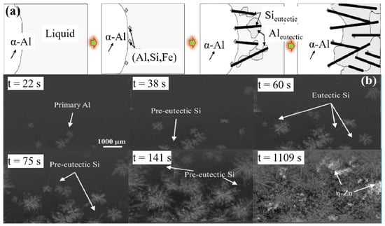 Most studies on the modification mechanism of eutectic Si is based on the nucleation and growth of eutectic Si [44,45,46]. Figure 5a shows the mechanism of eutectic Si nucleation and growth of hypo-eutectic Al–Si alloy [47]. Figure 5a shows that when the eutectic temperature is reached, the eutectic Si nucleates on the second phase β-(Al, Si, Fe), and then grows into the liquid in a thin morphology. Most studies on the mechanism of eutectic Si nucleation and growth usually investigate by means of cooling curve analysis, discontinuous solidification experiment and the cellular automata (CA) model [48,49]. However, these methods cannot capture the solidification morphology accurately in real time, and the simulation results are different from the experimental results. The synchronous X-ray method can realize the in-situ observation of the solidification process, which provides a good way for the real-time observation of eutectic Si. Mao et al. [50] studied the nucleation and growth process of eutectic Si in Al–Si alloy using synchronous X-ray technology. Due to the similar atomic number and density of Al and Si, it is difficult to distinguish the two morphologies by contrast. In order to improve the contrast at the solid–liquid interface and further distinguish the morphology of eutectic Si more easily, the researchers added Zn element to the Al–Si alloy. As shown in Figure 5b, the nucleation and growth process of eutectic Si can be clearly observed by in-situ X-ray observation.