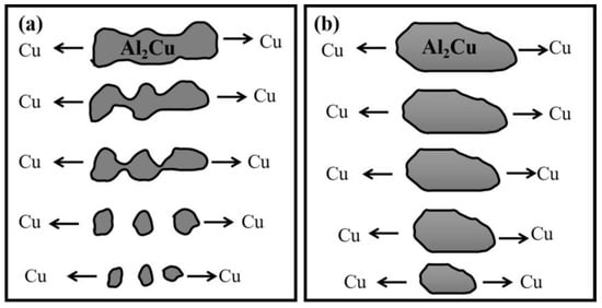 Dissolution process of Al2Cu particles with different morphologies [17]: (a) eutectic Al2Cu; (b) blocky Al2Cu.