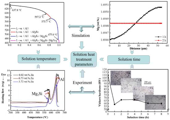 CALPHAD is one of the important methods in integrated computational simulation. Many researchers use this method to solve the problems in phase transition and heat treatment process optimization. Li et al. [89] used Pandat software to study the equilibrium phase diagram of Al–Zn–Mg–Si alloy, and found that α-Al, Si, Mg2Si and MgZn2 phases existed at 573 K, which was well verified by scanning electron microscopy (SEM) and differential scanning calorimetry (DSC), providing theoretical guidance for phase prediction. Zhang et al. [90] investigated the effects of Zn addition and related heat treatment parameters on the mechanical properties of Al–Si–Mg alloys by using a combination of experimental and thermodynamic methods. In addition, the CALPHAD method was used to optimize the heat treatment process parameters. As shown in Figure 8, the non-equilibrium solidification path was predicted by thermodynamic calculation, and the temperature of low melting point eutectic phase was measured by DSC experiment. In order to prevent the eutectic phase from over-burning, the solution temperature should be lower than the low melting point eutectic phase temperature. On the other hand, the homogenization and diffusion of elements is also the purpose of solution heat treatment. As shown in Figure 8, thermodynamic software was used to predict the time for elements to reach diffusion homogenization at a specific solution temperature, and the best solution time was obtained by combining the evolution of microstructure and hardness at different solution times.