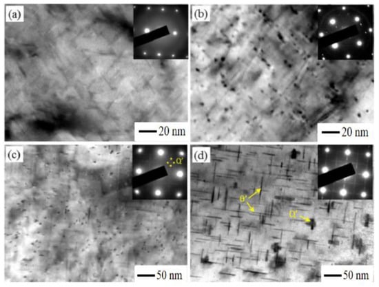 Bright-filed TEM image with corresponding SAED pattern of aged alloy [93]: (a) the precursor of the β’’ phase; (b) β’ phase; (c) Q’ phase; (d) Q’ and θ’ phase. TEM—Transmission Electron Microscopy; SAED—Selected Area Electron Diffraction.