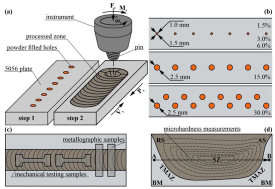 The FSP was carried out using the facilities and equipment provided by the Institute of Strength Physics and Materials Science SB RAS, Tomsk, Russia) (Figure 1a). The workpieces in the form of plates were cut off a 5 mm-thick AA5056 rolled sheet. The 3 mm in depth holes were then drilled in them, as shown in Figure 1b. These holes were filled with densified copper powder so that the total powder contents were 1.5, 3.0, 6.0, 15 and 30 vol.%, depending on the number and diameter of the holes drilled in each of the plates (Figure 1b). The powder contained 10.5 ± 0.5 μm particles of 99.5% pure copper Cu.