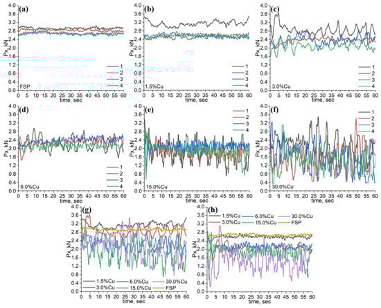 The plasticized metal reaction force Px vs. time for samples with 0 vol.% (a), 1.5 vol.% (b), 3.0 vol.% (c), 6.0 vol.%% (d), 15.0 vol.% (e), and 30.0 vol.% (f) Cu depending on the FSP pass number. The Px dependencies for the first (g) and fourth (h) passes on all samples.