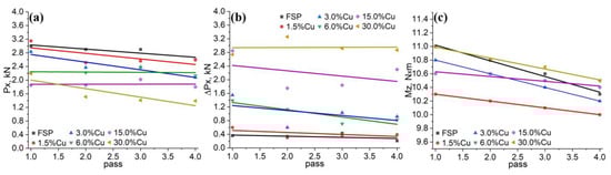 The reaction force (a), reaction force scatter (b) and torque (c) dependencies on the FSP pass number and concentration of copper in samples.