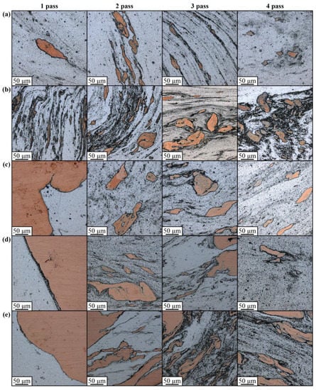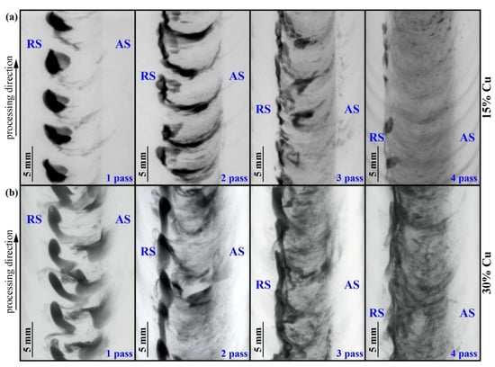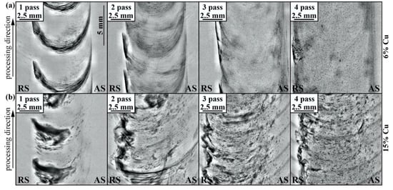 An analogous macrostructural pattern can be observed in samples with 3.0 vol.% Cu where the advancing side looks more heavily etched after the first FSP pass (Figure 4b). Large compacted copper areas can be observed after pass #3; however, they disappear after four FSP passes. Similar macrostructures were observed in samples containing 6 vol.% Cu (Figure 4c), except for the fact that large compacted copper chunks formed just after the first FSP pass. Increasing the copper content up to 15 vol.% resulted in the formation of a large compacted copper area on the advancing side after the first pass (Figure 4d). Further FSP passes served for breaking it into the smaller ones so that none of them have been observed after pass #4. The 30 vol.% Cu sample is characterized by greater inhomogeneity, in which even the 4-pass FSP is not effective for full homogenization of the compacted copper.