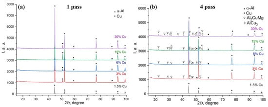 All the above-discussed results allow suggesting that the single-pass FSP is not enough to initiate the most intensive structural and phase changes. The X-ray diffraction (XRD) pattern obtained after both the first and forth FSP passes on the 1.5 vol.% Cu sample only showed the α-Al(Cu) peaks (Figure 6a,b). The 1-pass FSP on the 3 to 30 vol.% Cu samples allowed the formation of α-Cu (Al) peaks, in addition to the α-Al (Cu) ones (Figure 6a). So far, no IMC peaks have been detected in these diffractograms. This suggests that the exothermic reaction-diffusion between Al and Cu was not intensive enough, despite the fact that the reaction force values corresponding to the first FSP pass in Figure 3a are less than that of the 1.5 vol.% Cu. Regarding 4-pass FSP, all the diffractograms obtained from 3 to 30 vol.% Cu samples demonstrated the presence of both α-Al(Cu) and α-Cu(Al), as well as Al2CuMg and AlCu3 IMCs, the content of which increased with that of copper powder (Figure 6b).