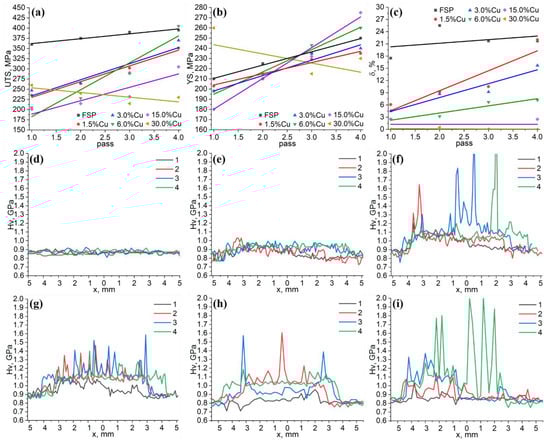 The ultimate tensile stress (UTS) (a), yield stress (YS) (b), strain-to-fracture (STF) (c) dependencies on pass number and copper content, microhardness profiles for AA5056 after FSP (d), 1.5%Cu (e), 3% (f), 6% (g), 15% (h) and 30% (i) copper samples.