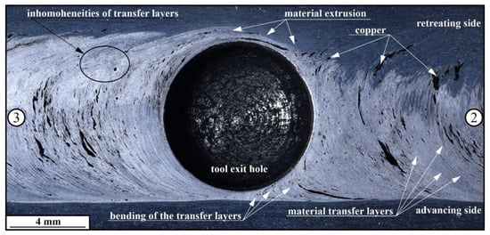 Taking into account the XCT images obtained from the 6.0 vol.% Cu sample, it could be suggested that the copper particle dispersion in the AA5056 stir zone occurs synchronously with the plasticized metal transfer, i.e., with highly efficient stirring provided by the combination of adhesion transfer and extrusion (Figure 10).