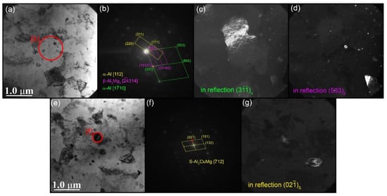 Bright-field (a,e) with corresponding SAED patterns (b,f) and dark-field (c,d,g) TEM images of α-Al(Cu) grain (a) as well as β-Al3Mg2 (d) and S-Al2CuMg (g) particles obtained using reflections (), (533) and (), respectively.