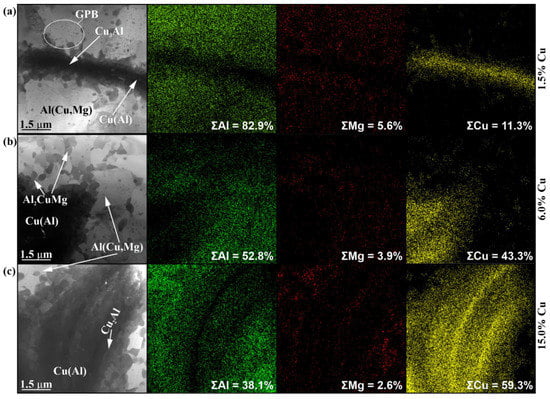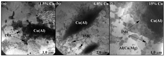 The IMC formations in the sample with 6 vol.% Cu look rather as IMC agglomerates composed of smaller IMC grains (Figure 13b). The same is even more obvious with the TEM images of IMCs in the 15 vol.% Cu sample (Figure 13c). At the same time, the EDS maps show some thin copper-rich streaks in them that may represent the unreacted copper core (Figure 13c). The concentration of copper is maximum in the IMCs, which are surrounded by α-Al(Cu) solid solution grains with some smaller IMC precipitates (Figure 14a–c) formed as a result of deformation and breakage of large compacted copper streaks by the plasticized metal flows.
