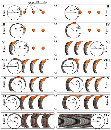Adhesion of the plasticized metal to the tool surface is an important factor of the metal transfer in FSP, but since the adhesion of copper to the tool is weaker compared to that of more plasticized AAA5056, large friction compacted copper particles settle on the retreating side and only partially transfer to the zone behind the tool (Figure 15, pos.5). Interaction of the FSP tool with the copper-filled holes would create a periodic pattern, as shown in Figure 15, pos.6. This situation changes when copper is derived from the two rows of the copper-filled holes, where copper is more intensively stirred in the row close to the advancing side. However, despite this, the above-discussed considerations regarding the friction compaction of powder still make sense.