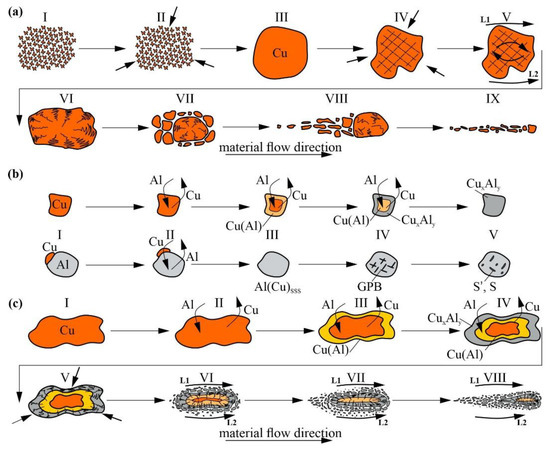 The second interesting process is diffusion between Cu and Al with the following formation of solid solution and Al-Cu IMCs (Figure 16b). The intensity of reaction-diffusion in metal flows may be enhanced, so that the IMCs may form from the very beginning of the FSP process despite their presence, is not yet detected by XRD. It was shown earlier that the Al-Cu IMCs may form in the overlap of FSP via a liquid phase, as evidenced by the presence of low-melting eutectics [24]. However, no evidence for the presence of the liquid phase was found in this experiment with the use of copper in the form of powder instead of overlapping copper and aluminum alloy sheets. Therefore, a solid-state reaction-diffusion is proposed here with the formation of IMCs (Figure 16b, pos.I-V). in addition, a solid solution of copper in aluminum is formed where S particles nucleate in accordance with the Guinier–Preston zone hardening mechanism in Al-Cu alloys [46,47] and then grows into large IMCs. The third process can be described as combining large IMC copper-core particle fragmentation and admixing the fragments into the stir zone metal (Figure 16c).