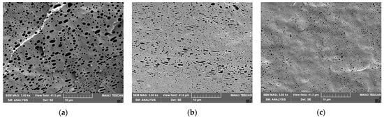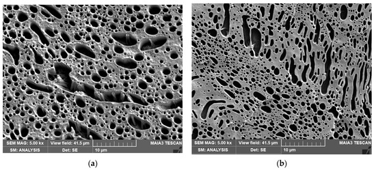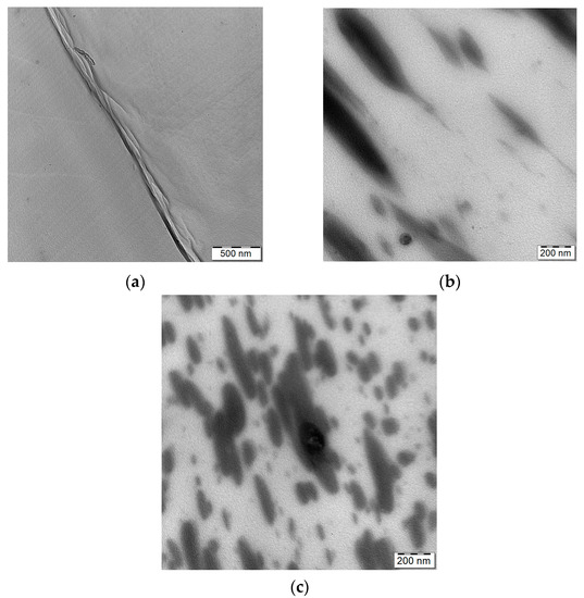 The structure was examined using scanning electron microscopy (SEM) with a Maia microscope (FEI, Brno, Czech Republic). The injection-molded specimens broken under liquid nitrogen were etched in 20% NaOH for 20 min to remove the PLA component in the PCL matrix and bicontinous samples; the PLA matrix samples were etched with THF vapor at 45 °C for 4 min to “visualize” PCL inclusions [34]. The surface of unetched samples is shown in Figure S1. The size of the dispersed particles was investigated using a MINI MOP image analyzer (Kontron Co., Munich, Germany) with manual marking of the circuit of the evaluated particles. At least 200 particles were evaluated in each sample. For the Tecnai G2 Spirit transmission electron microscope (TEM) (FEI, Brno Czech Republic) observations, ultrathin (60 nm) sections were prepared under liquid nitrogen using an Ultracut UCT ultramicrotome (Leica Mikrosysteme GmbH, Wien, Austria).