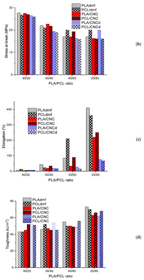 Elongation is also reduced by NF; the relatively marked difference also confirms the important role of structural transformations. Of interest is the highest value of toughness for PCL/CNCd, despite the fact that the continuous PCL phase contains a relatively high amount of the PLA inclusions. Here, we can consider a possible contribution of their plastic deformation in this ductile/brittle phase.