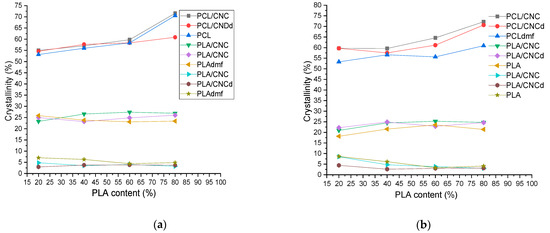 (a) Crystallinity of samples prepared using CNC and CNCd masterbatch in PLA, and DMF-treated PLA (PLAdmf); (b) Crystallinity of samples prepared using CNC and CNCd masterbatch in PCL, and DMF-treated PCL (PCLdmf);The three sets of plots (from top to bottom) are the crystallinity of PCL, cold crystallization of PLA after heating, and initial crystallinity of PLA, respectively. Each set contains PLA/CNC masterbatch, PLA/CNCd masterbatch, and NF-free blend (PLAdmf).