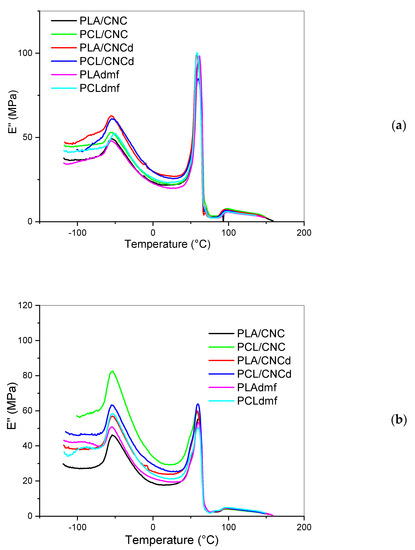 Temperature dependence of loss modulus of (a) 60/40 PCL/PLA ratio, and (b) 40/60 ratio.