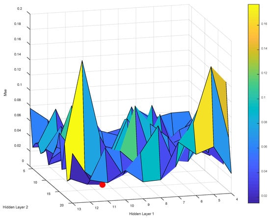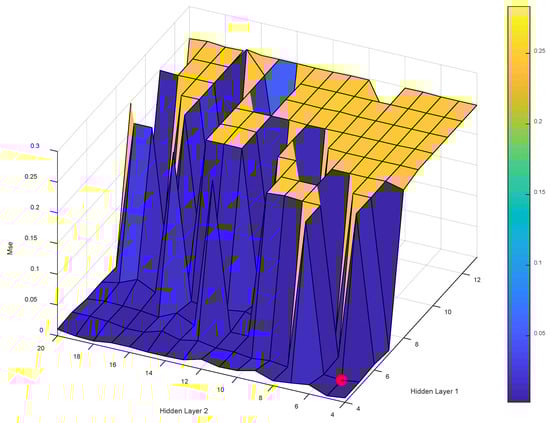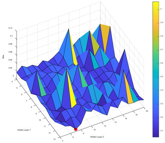 After determining the range of values for the number of nodes in the first and second hidden layers according to the empirical formula, the neural network modeling is performed, and the MSE of all models built by the LM-ANN can be obtained when the number of neuron nodes in the first and second hidden layers are different, as shown in Figure 4. (Detailed information is provided in attached Table 1.)